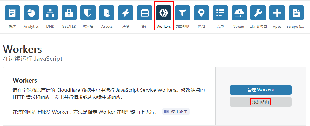 绑定域名回到域名管理,选择你的域名点击Workers,点击添加路由