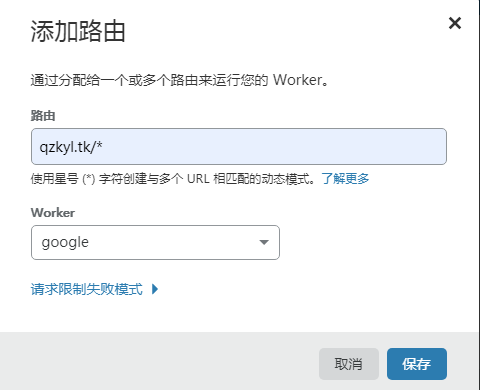 路由填写你需要解析的域名,Workers选择刚刚新建的Workers项目名